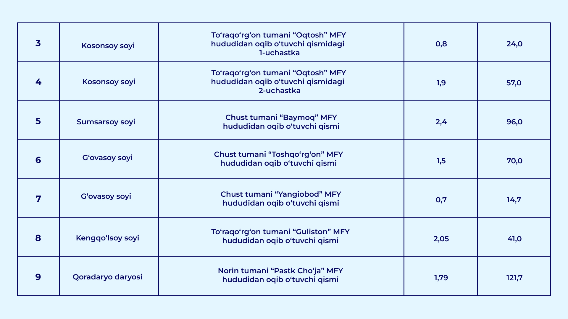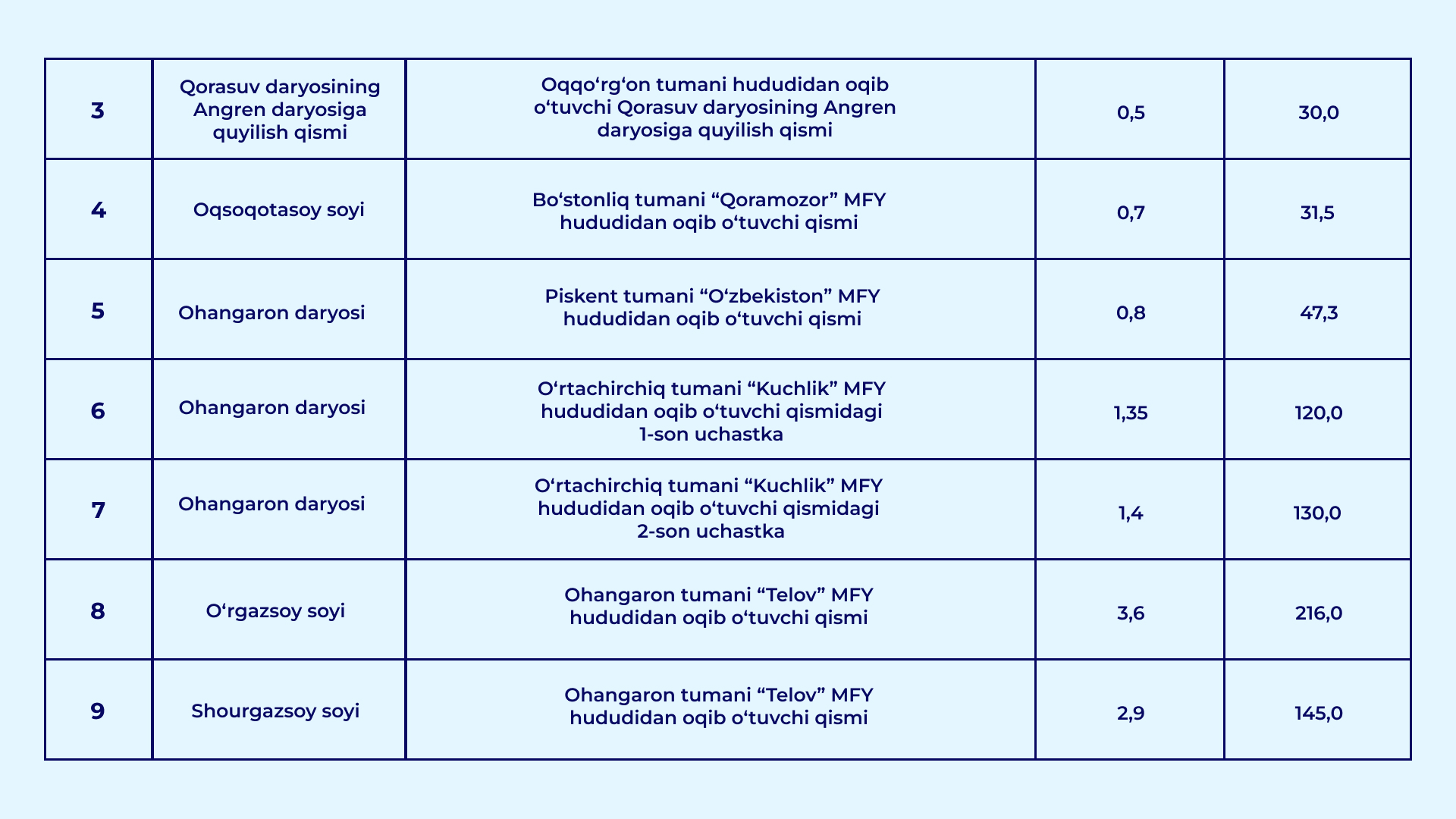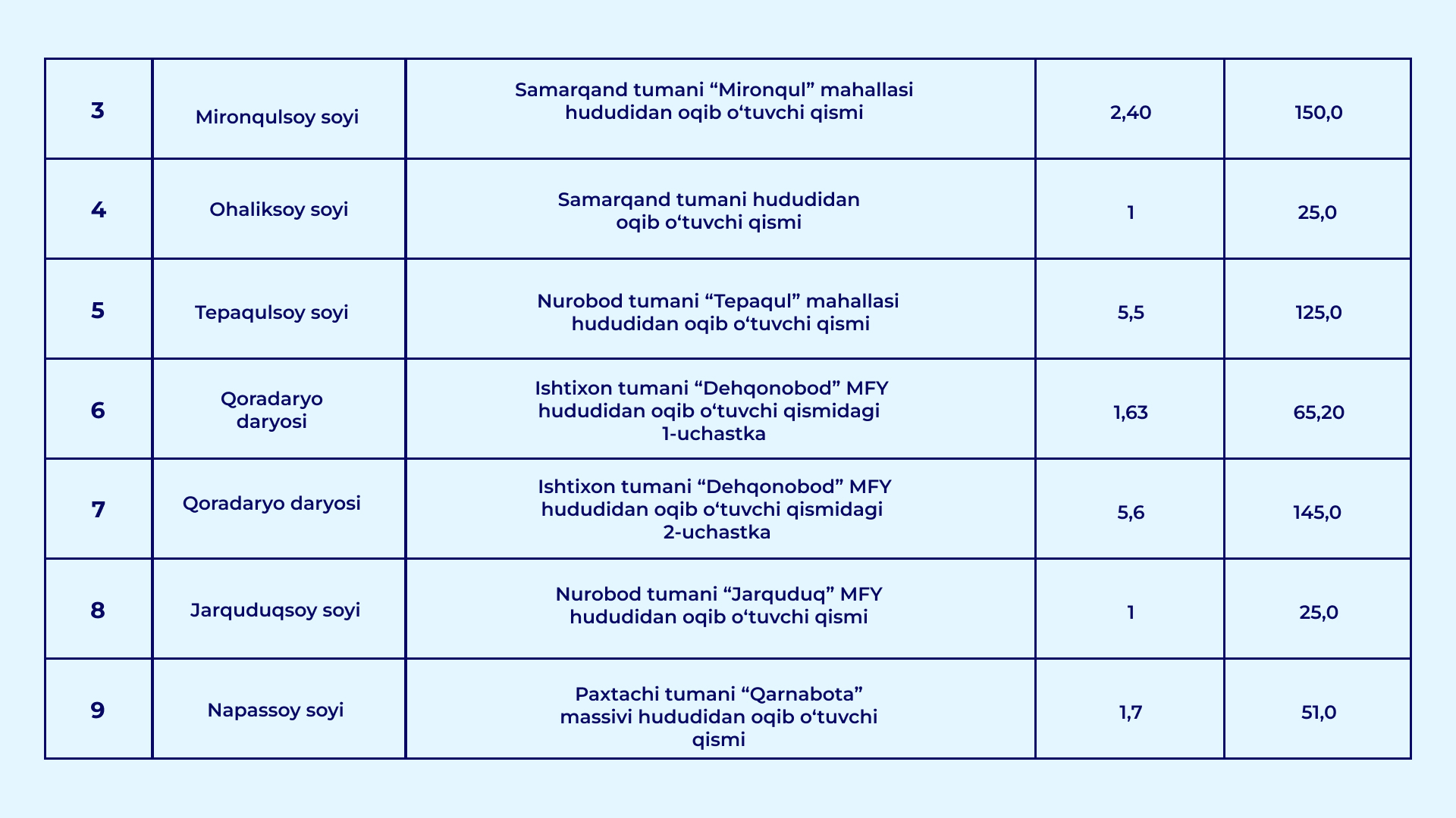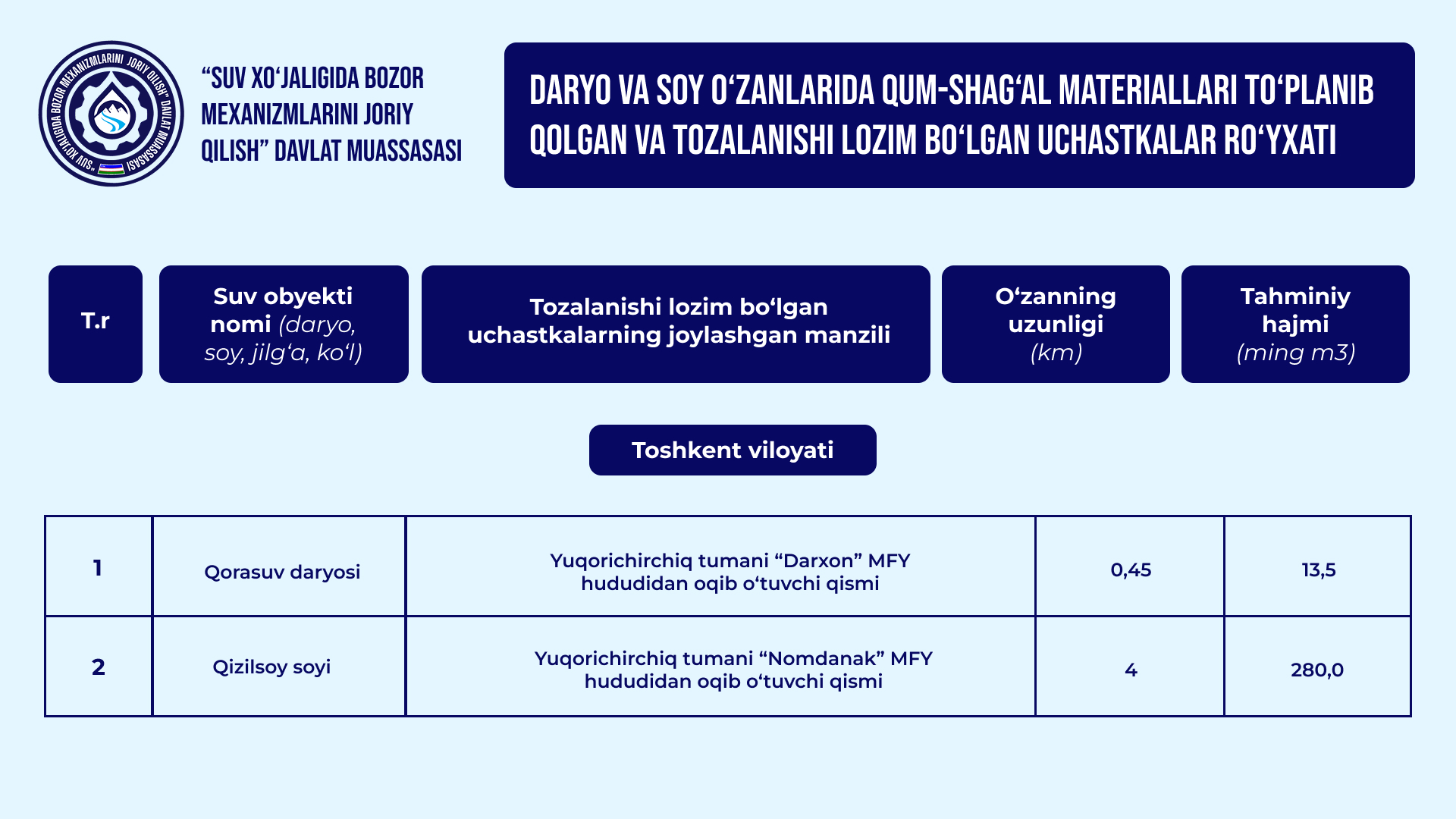 O‘zbekiston Respublikasi Vazirlar Mahkamasining 2026-yil 30-yanvardagi "Qurilish obyektlarining arzon qum-shag‘al materiallariga bo‘lgan talabini qondirish hamda ularning narxi barqaror bo‘lishini ta’minlash chora-tadbirlari to‘g‘risida" gi 39-sonli qarori bilan daryo va soy o‘zanlarida qum-shag‘al materiallari to‘planib qolgan va tozalanishi lozim bo‘lgan uchastkalar ro‘yxati tasdiqlandi.
