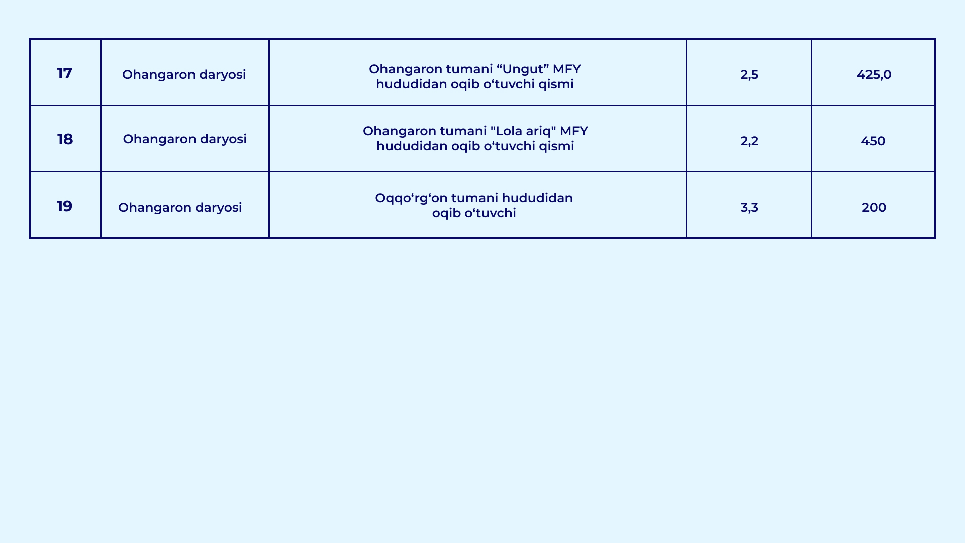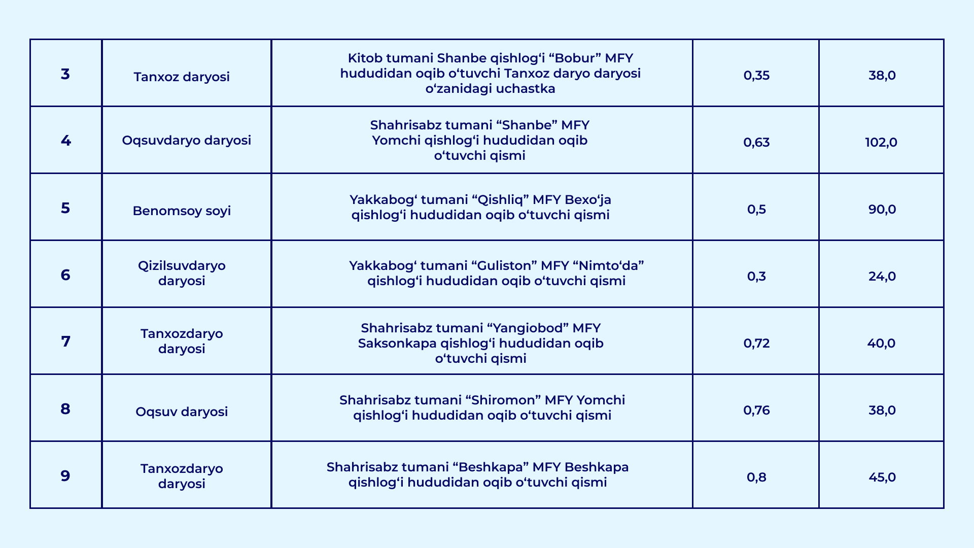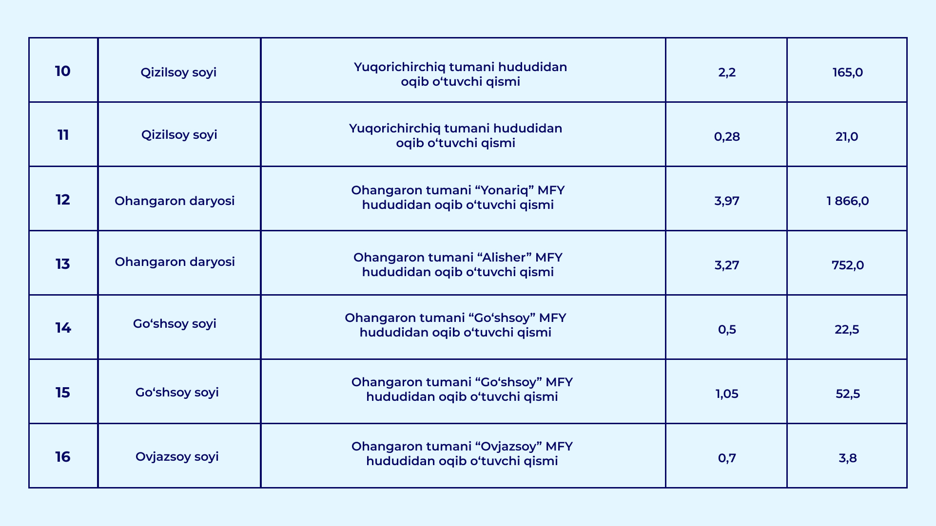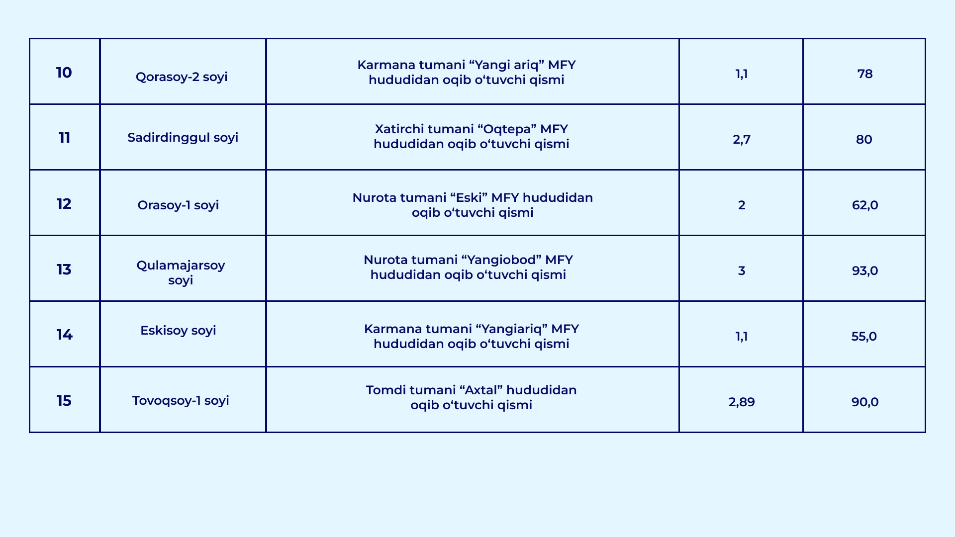 O‘zbekiston Respublikasi Vazirlar Mahkamasining 2026-yil 30-yanvardagi "Qurilish obyektlarining arzon qum-shag‘al materiallariga bo‘lgan talabini qondirish hamda ularning narxi barqaror bo‘lishini ta’minlash chora-tadbirlari to‘g‘risida" gi 39-sonli qarori bilan daryo va soy o‘zanlarida qum-shag‘al materiallari to‘planib qolgan va tozalanishi lozim bo‘lgan uchastkalar ro‘yxati tasdiqlandi.