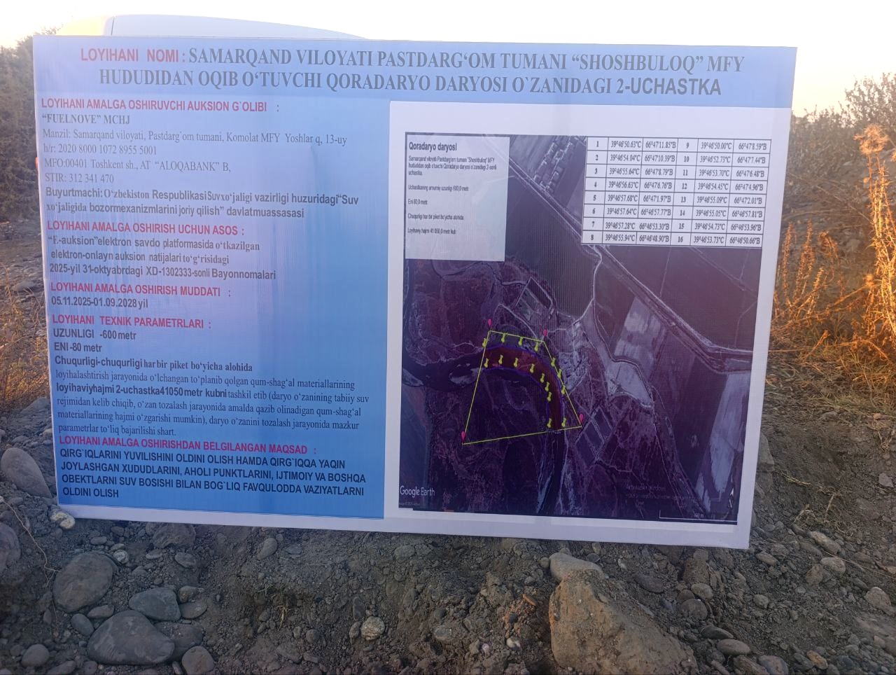 “E-AUKSION” elektron savdo platformasining bayonnomasiga asosan, “Suv xo‘jaligida bozor mexanizmlarini joriy qilish” davlat muassasasi va “FUELNOVE” mas’uliyati cheklangan jamiyati o‘rtasida Samarqand viloyati Pastdarg‘om tumani “Shoshbuloq” MFY hududidan oqib o‘tuvchi Qoradaryo daryosi o‘zanidagi uchastkada o‘zan tozalash jarayonida qum-shag‘al materiallarini qazib olish ishlari loyihasini amalga oshirish huquqi uchun shartnoma imzolandi.