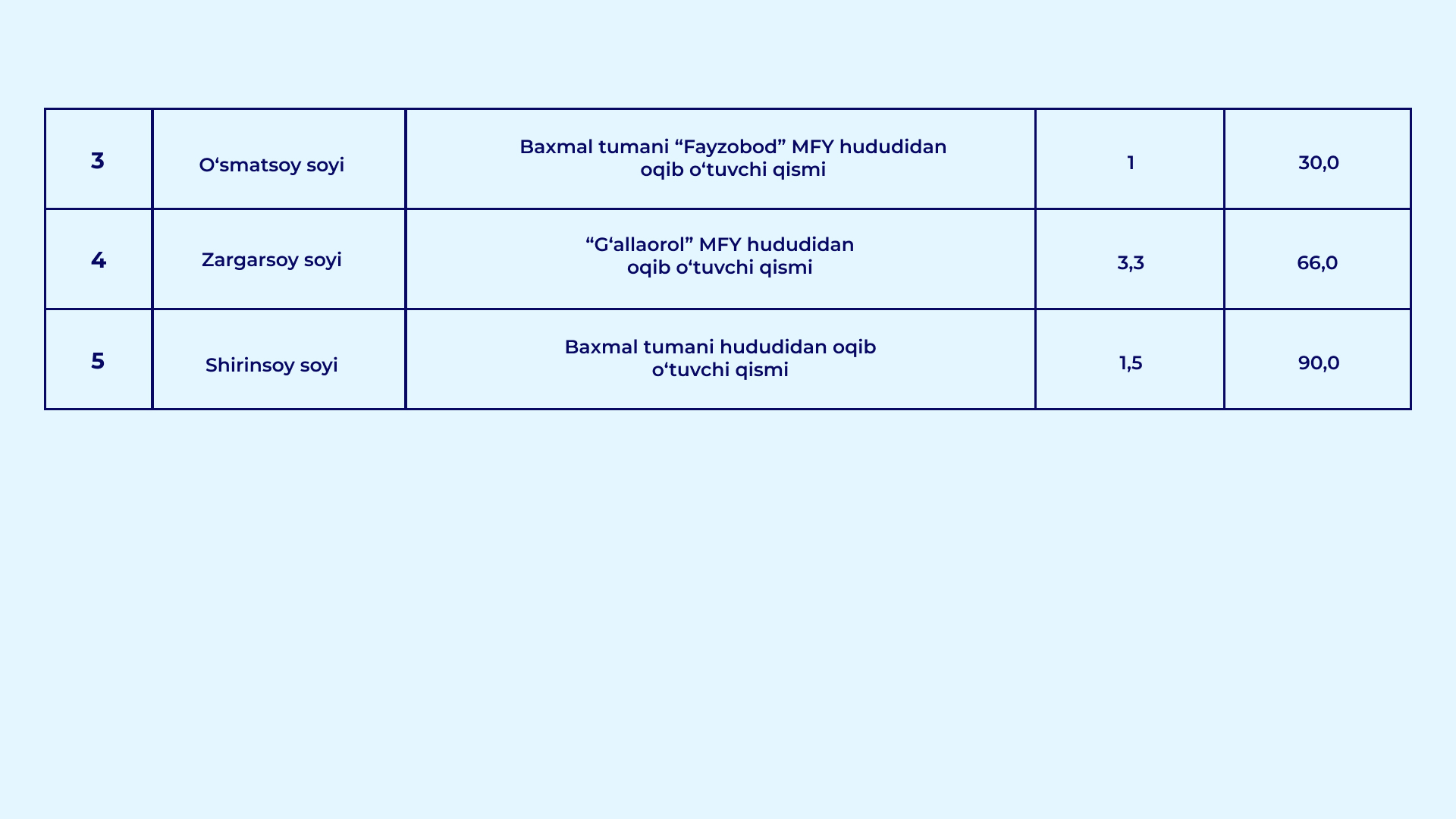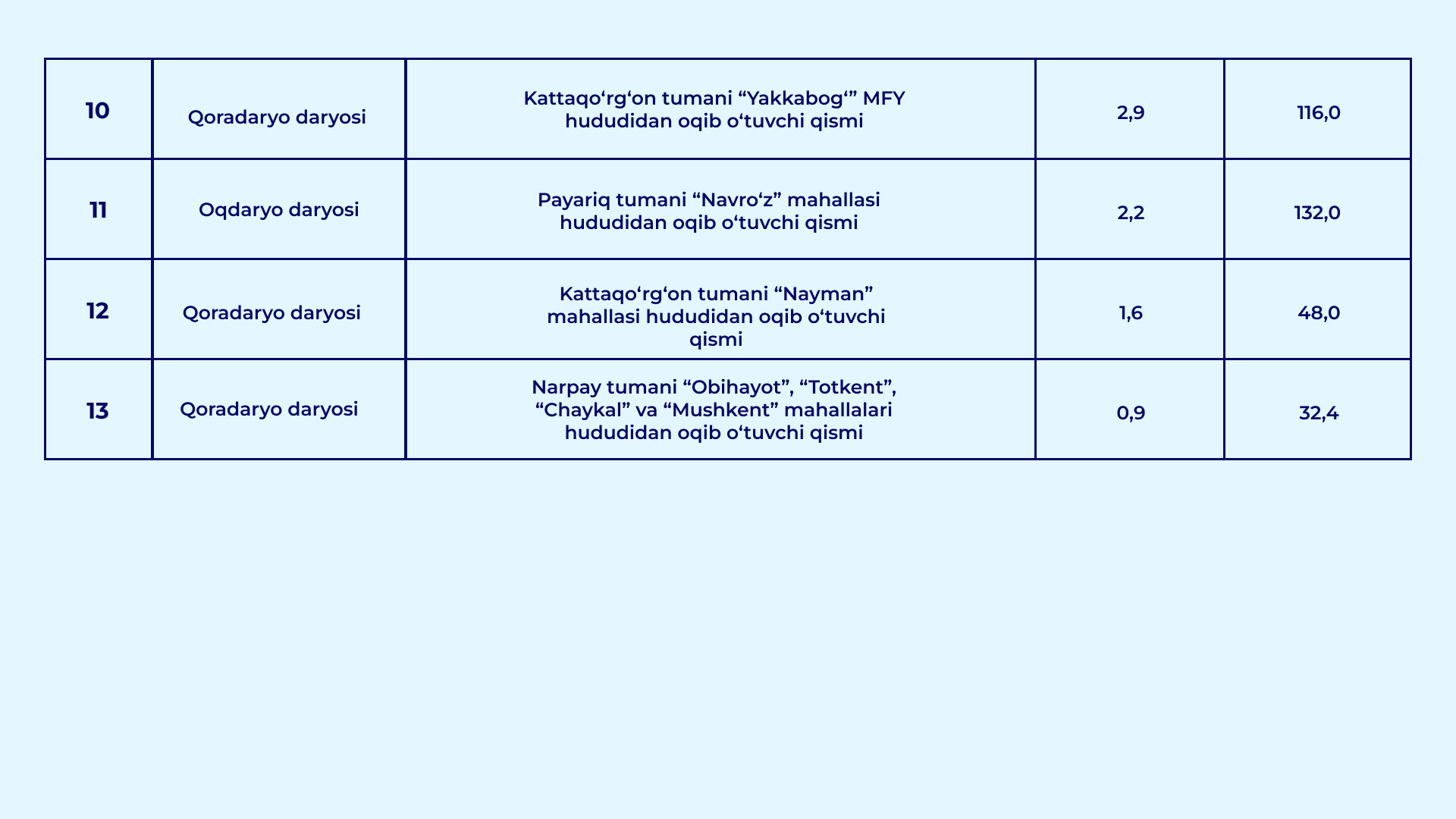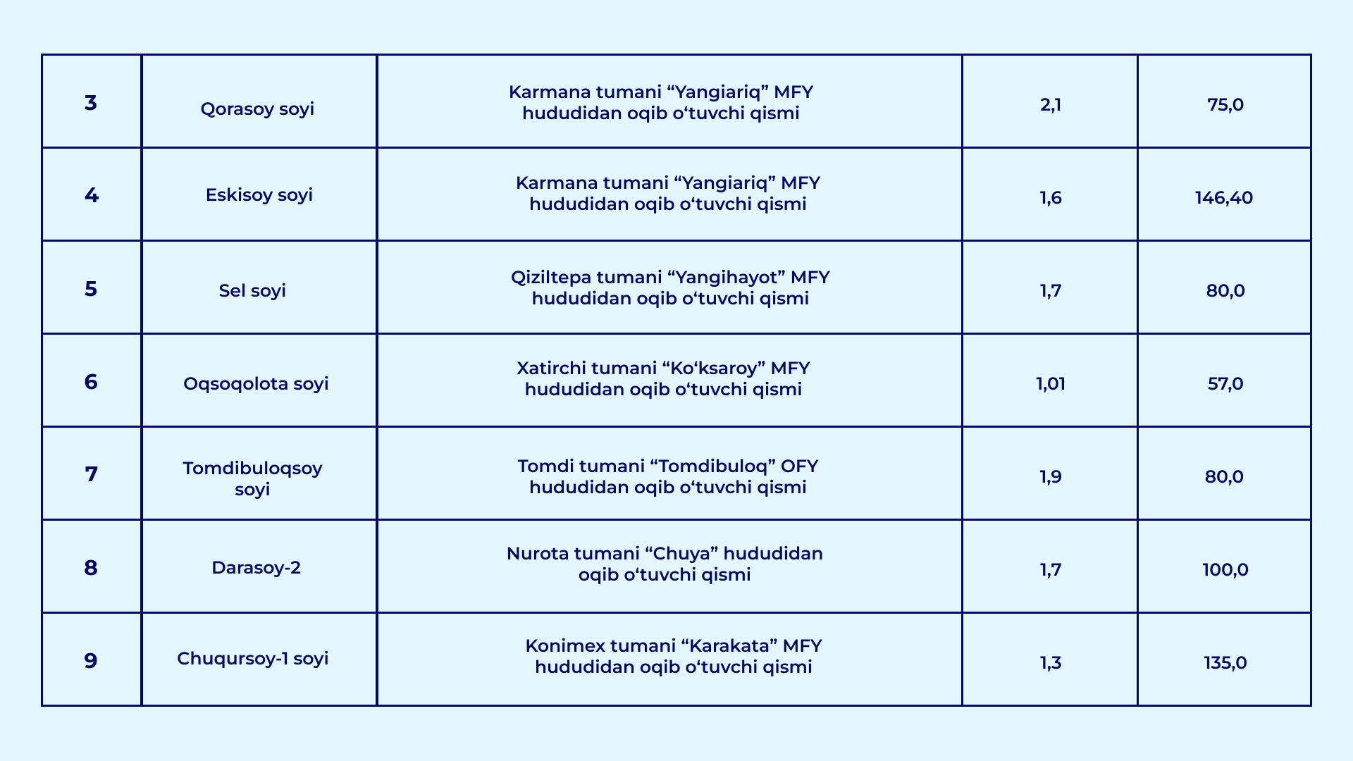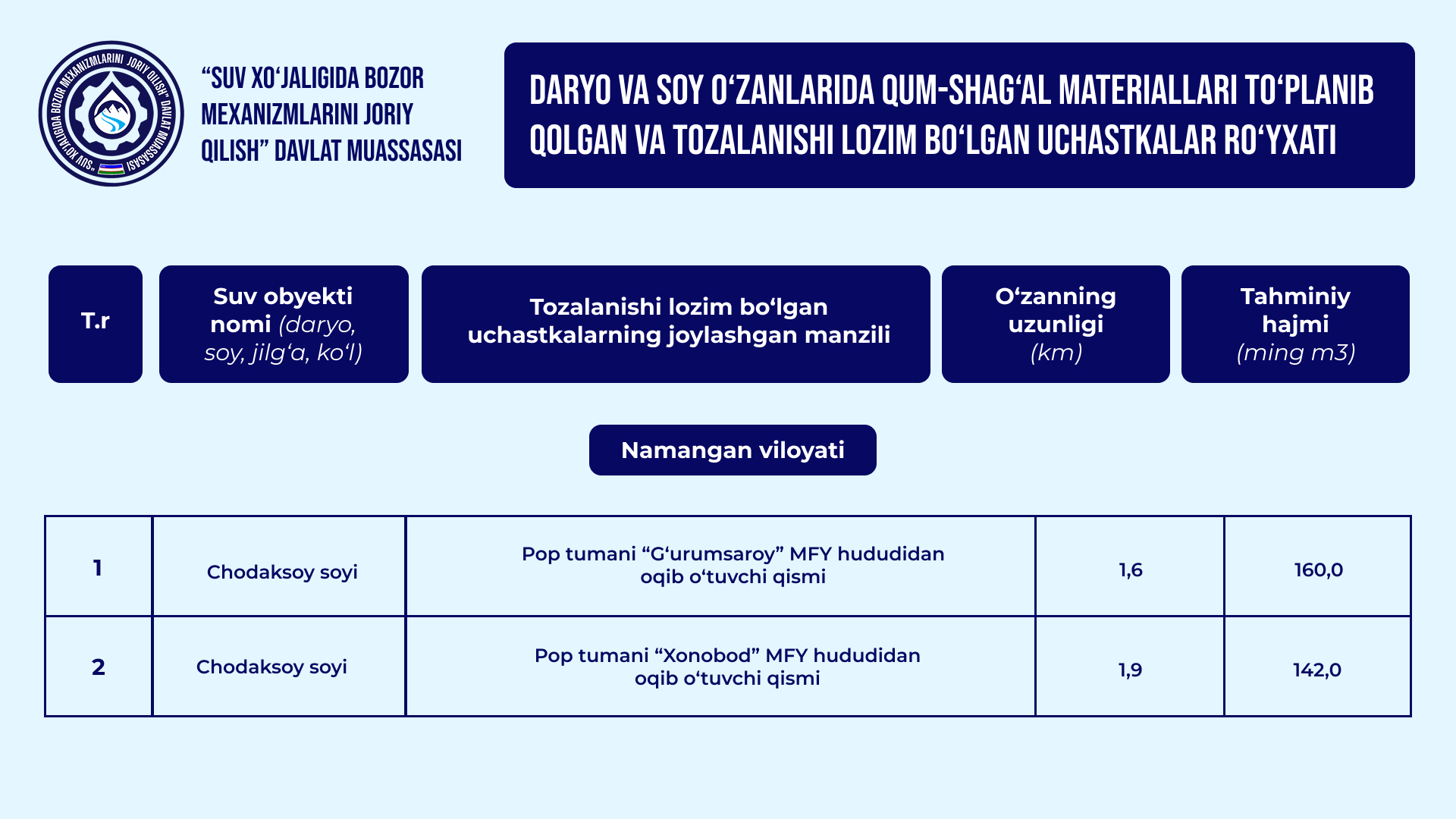 O‘zbekiston Respublikasi Vazirlar Mahkamasining 2026-yil 30-yanvardagi "Qurilish obyektlarining arzon qum-shag‘al materiallariga bo‘lgan talabini qondirish hamda ularning narxi barqaror bo‘lishini ta’minlash chora-tadbirlari to‘g‘risida" gi 39-sonli qarori bilan daryo va soy o‘zanlarida qum-shag‘al materiallari to‘planib qolgan va tozalanishi lozim bo‘lgan uchastkalar ro‘yxati tasdiqlandi.
